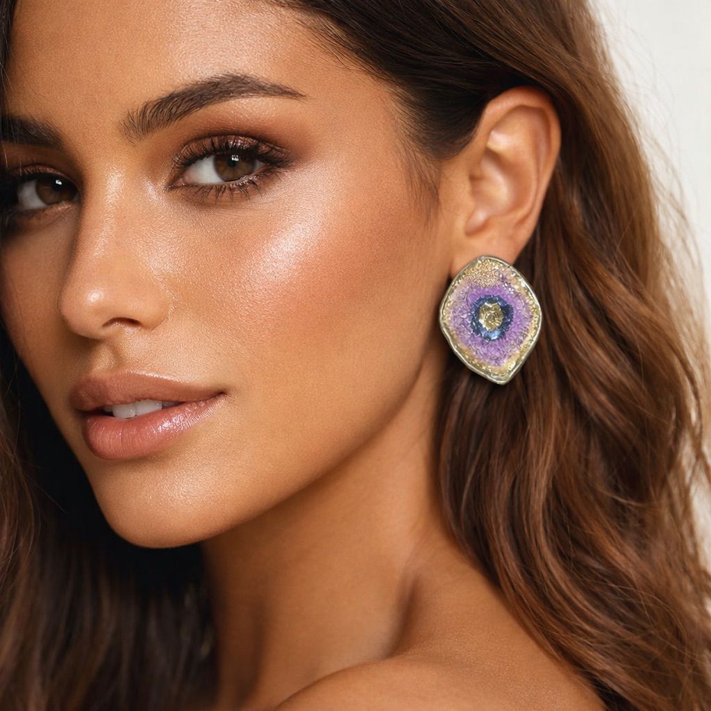 Los Geodas Malva son pendientes artesanales con textura efecto drusa y un degradado en tonos malva y dorado. Ligeros, brillantes y llenos de personalidad para elevar cualquier look.