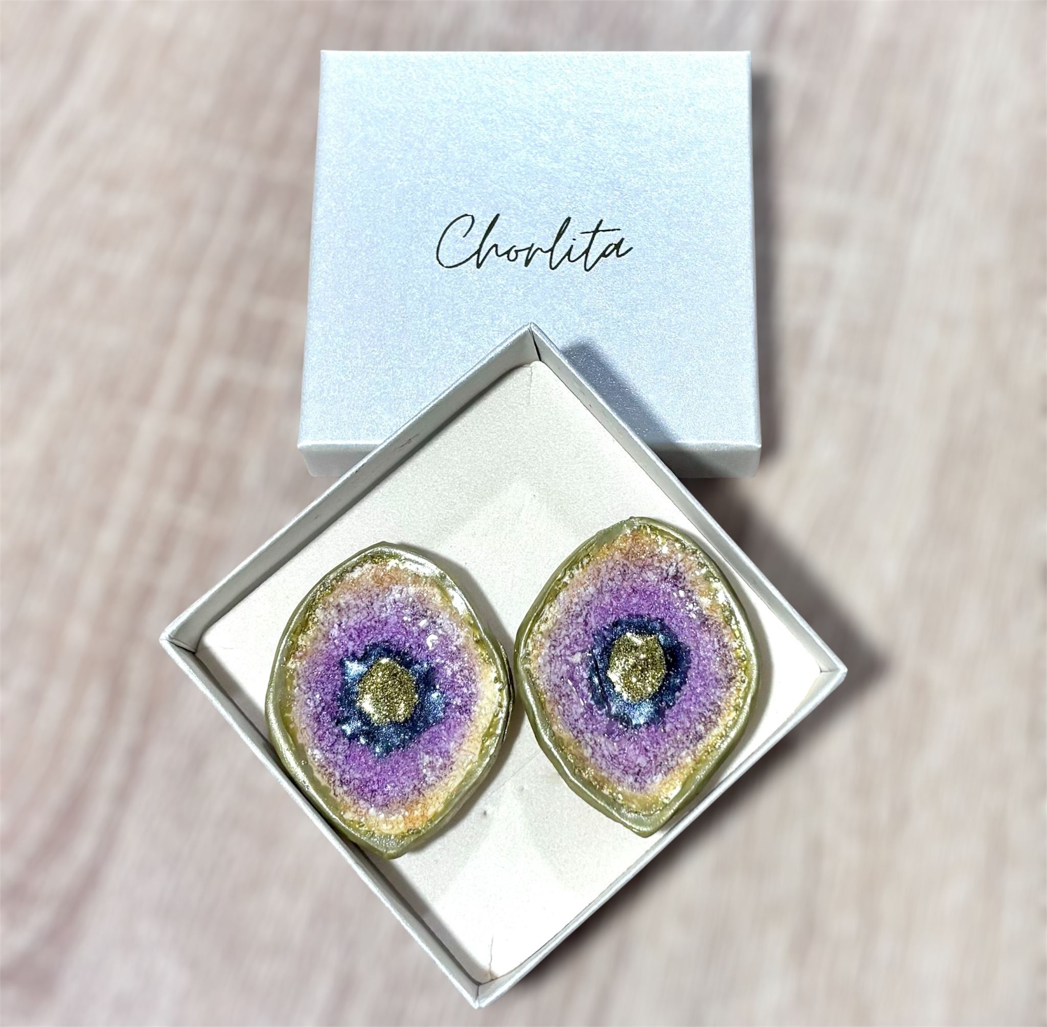 Los pendientes Geodas Malva 01 son unos pendientes artesanales inspirados en la belleza de las geodas naturales. Su acabado brillante tipo drusa crea un efecto mineral único, con el centro dorado  que se fusiona con un anillo negro profundo y un degradado malva suave que aporta luminosidad y armonia al diseño.