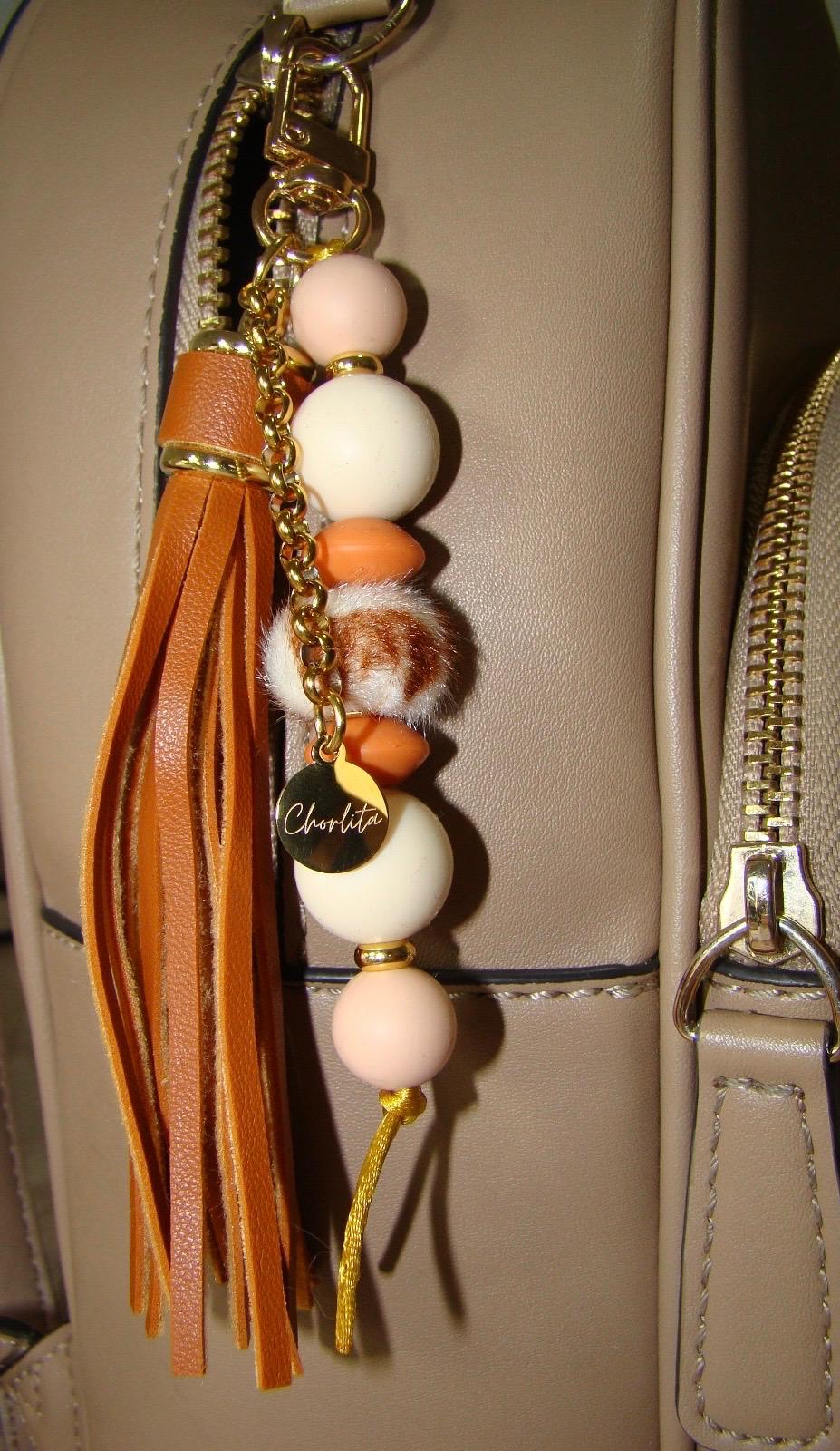 El llav003 de Chorlita con tonos naranjas y rosa empolvado, borla marrón y cadena dorada de acero inoxidable con chapita grabada con el logo.