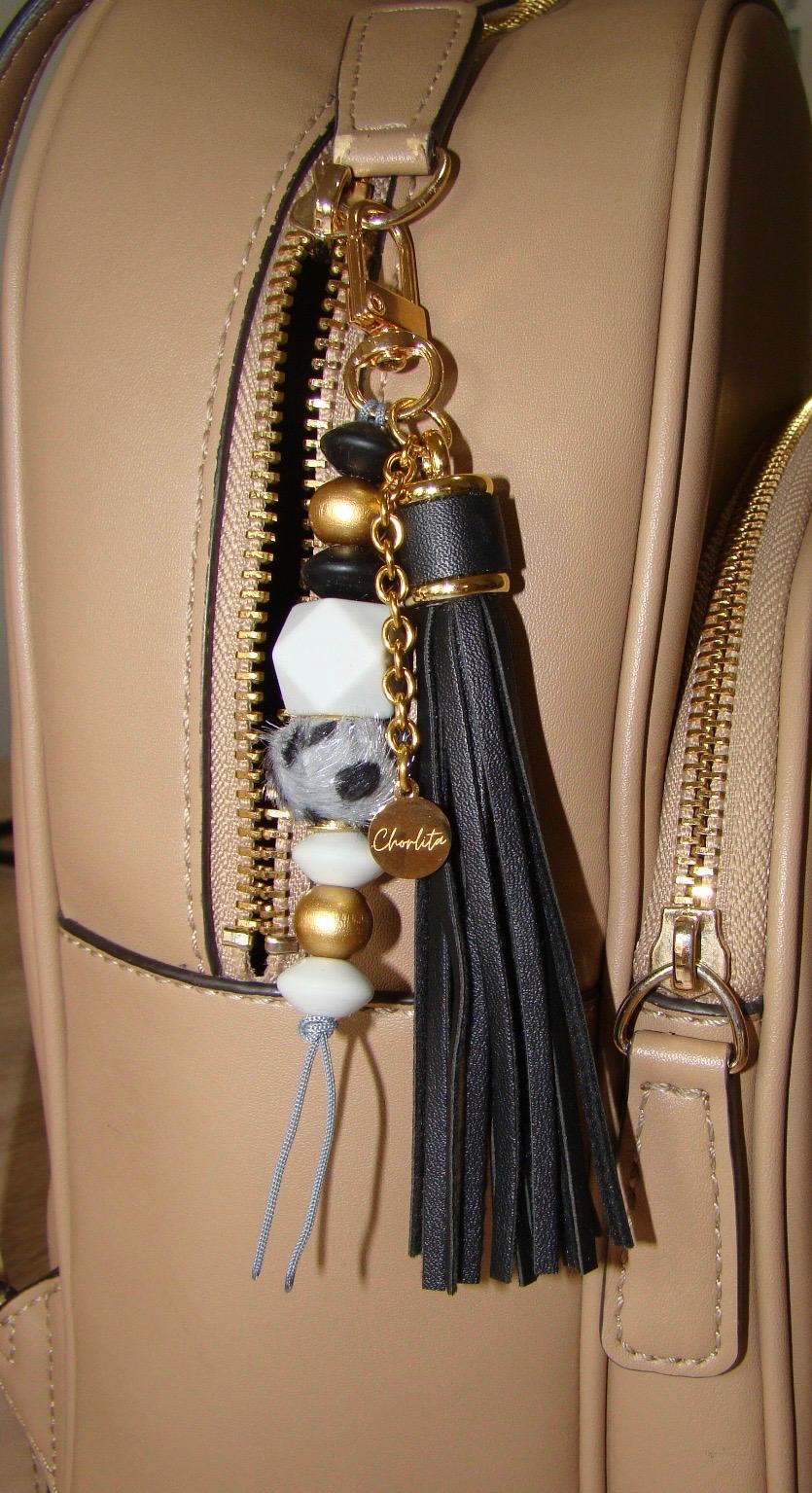 El llav004 esta creado con cuentas grisáceas de diferentes formas geométricas y negras de silicona y doradas de madera, además lleva una cuenta de pelo sintetico de color gris y negro de animal print. Incluye una cadena de acaero inoxidable dorada de la que cuelga una chapita dorada también de acero inoxidable y una preciosa borla negra de piel sintética. Un llavero elegante que podras usar para tus llaves o para tus bolsos.