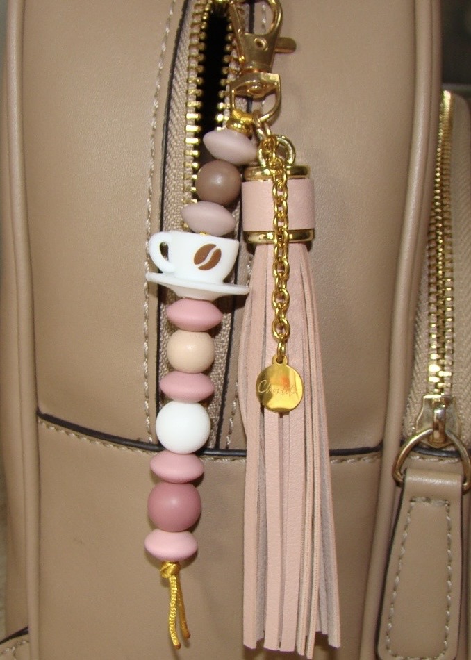 Este Llavero taza rosa con borla, es artesanal y es el accesorio ideal para amantes del café y los detalles especiales. Está compuesto por una divertida figura de taza de café entre cuentas en tonos rosados, blancos y nude, aportando un estilo dulce y femenino.