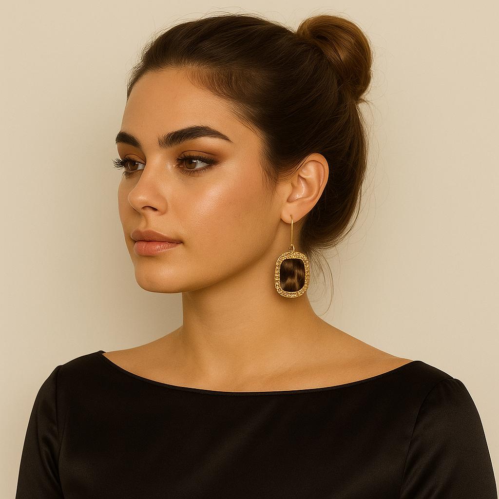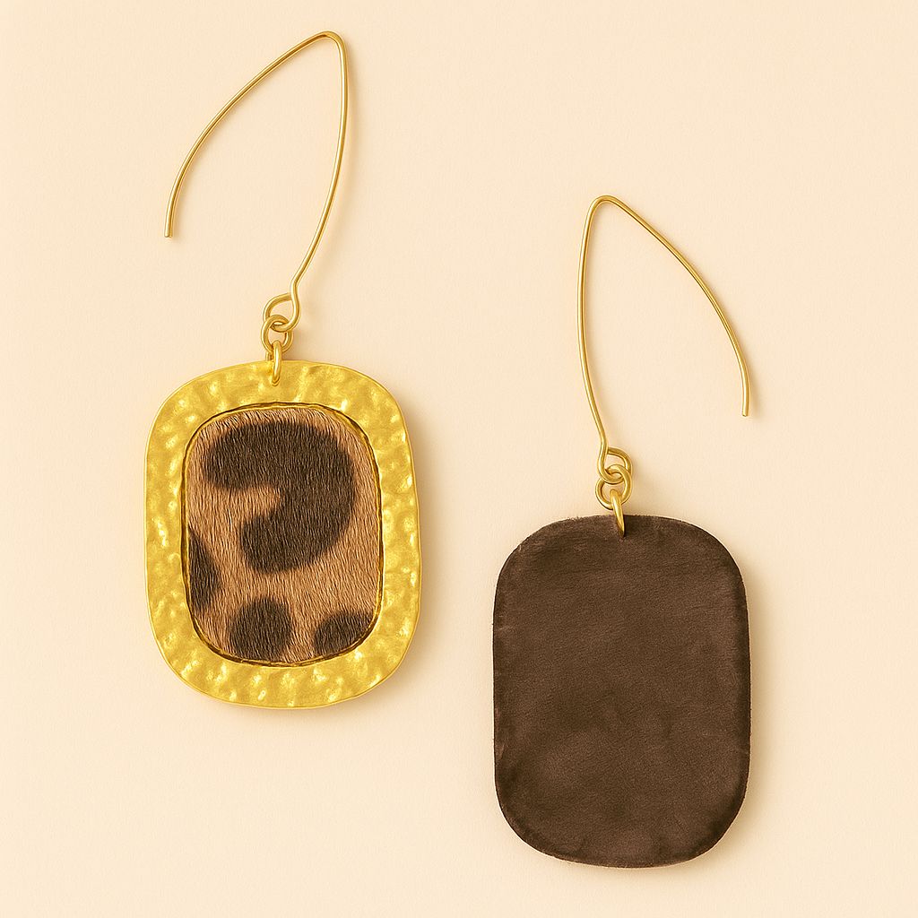 Los pendientes Kara destacan por su equilibrio entre elegancia y fuerza natural. Hechos a mano combinan una base con textura dorada martillada y su centro de piel de vacuno natural con estampado marron de animal print. Son únicos, elegantes y sofisticados, perfectos para elevar cualquier look con un toque exótico y refinado. La parte trasera esta forrada con terciopelo marrón y su base es de gancho de acero inoxidable.