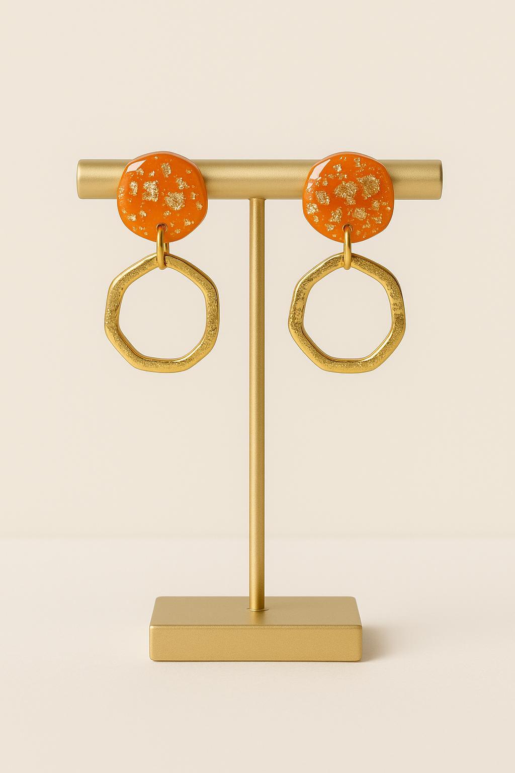 Los pendientes Oria son una pieza única de bisuteria artesanal que combina el encanto del color naranja con el brillo sofisticado del dorado. Su diseño circular irregular aporta un estilo moderno y elegante que no pasa desapercibido. Elaborados con arcilla polimérica, cada par está trabajado a mano con un diseño exclusivo. Son ligeros y cómodos, perfectos para lucir durante todo el dia sin renunciar a la elegancia.